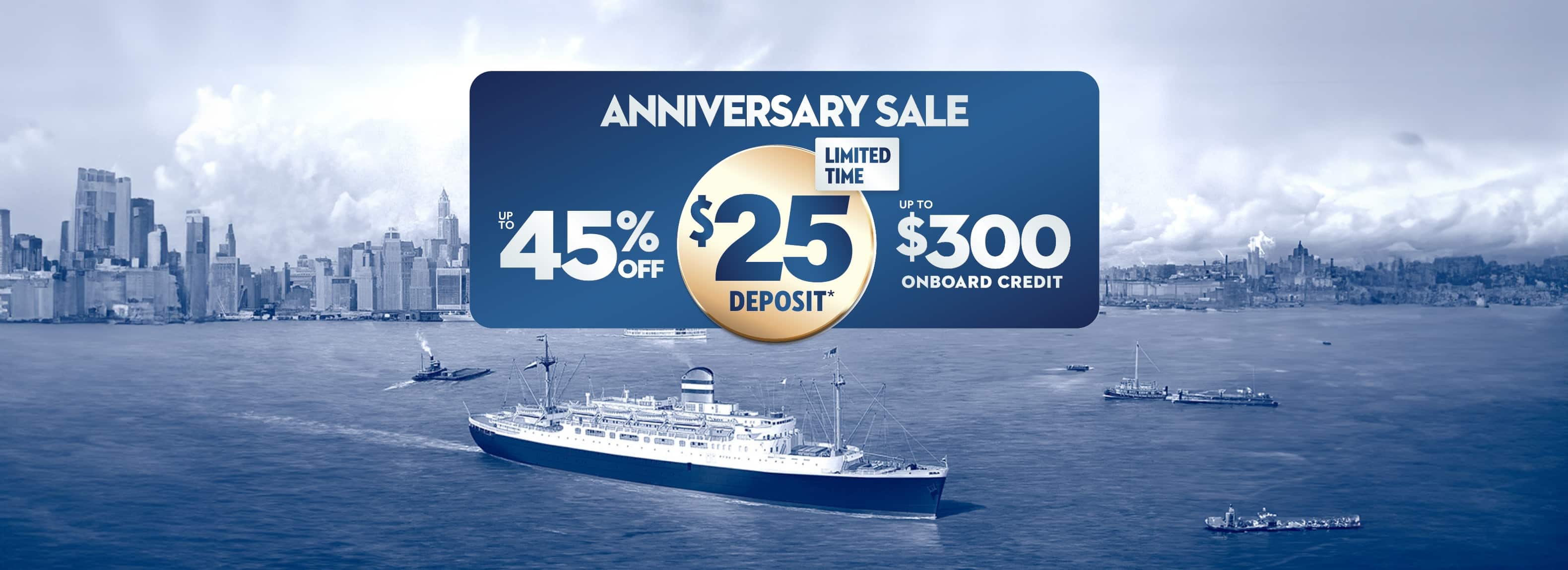 Celebrate our Anniversary with a low $25 deposit and enjoy up to 45% off cruise fares. Plus get up to $300 Onboard Credit per stateroom* Join us as we celebrate over 150 years of cruising. Book now!