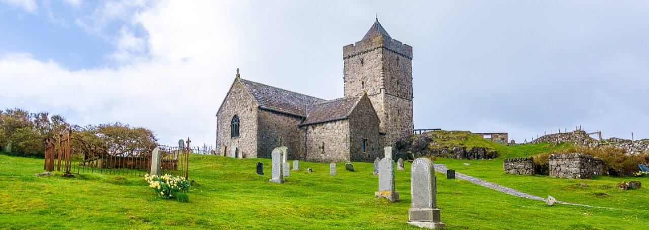 Journey to Rodel — Harris' southernmost point — to visit St Clement's Church. This fine 16th-century church fell on hard times after the Reformation but was extensively repaired in the 18th and 19th centuries. It is widely acknowledged to be the grandest medieval building anywhere in the Western Isles and houses the tomb of the church's founder, Alexander MacLeod. It also carries the best collection of medieval sculpture in the Western Isles. But perhaps the most striking aspect of St Clement's Church is its tower, built on a rocky outcropping at the west end of the church.