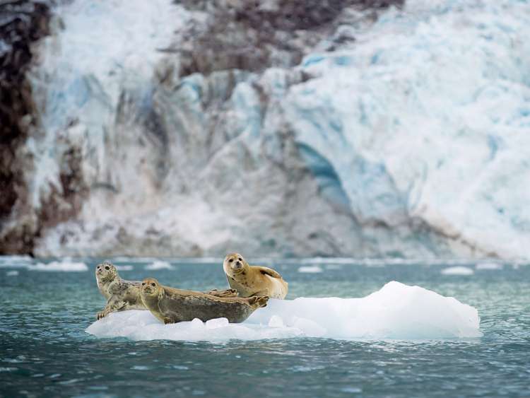 Beloved for their spotted coats and curious expressions, harbor seals are a regular sight on beaches, ice floes, and floating glacial ice.