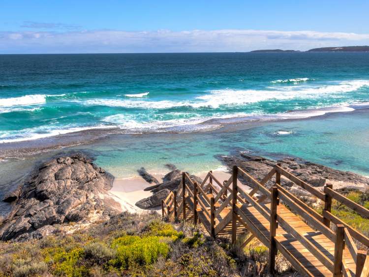 Famed for its picture-perfect white-sand beaches, aquamarine waters and rosy-hued lakes, the south coast of Western Australia is among the most isolated and beautiful areas of this island continent. The gateway to this natural splendor is Esperance, which gets its name from a French vessel, the Espérance, that made landfall here in 1792. The town overlooks the Recherche Archipelago (also known as the Bay of Isles), a group of around 100 islands that are scattered across nearly 4,000 square kilometers (1,500 square miles) and boast remarkable reefs and abundant sea and birdlife. The calm waters of Esperance Bay make it an ideal spot for swimming, diving, snorkeling and fishing; nearby surf breaks produce big waves that can rival those in Hawaii. There are a number of walking trails along the coast and around the area’s pink lakes, which get their color from the red-tinged algae. And national parks and nature reserves surround the city, showcasing the pristine beauty of the region. The best known of these is Cape Le Grand National Park, a 45-minute drive from Esperance, where gray kangaroos roam the wildflower-covered coastal stretches of heathland.